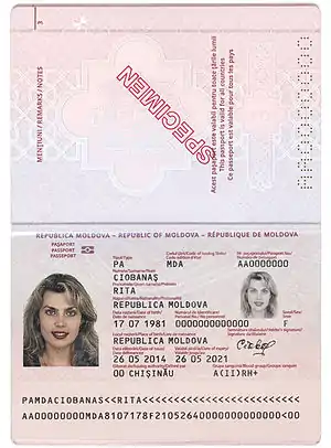 ![]() Обложка биометрического паспорта гражданина Республики Молдовы образца 2014 года | |