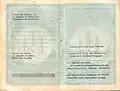 - На первую и вторую страницы паспортной книжки заносятся фамилия, имя и отчество, дата и место рождения. На первой странице также вклеивается фотокарточка и отводится место для подписи его владельца. На вторую страницу заносятся сведения о пол, дату выдачи и орган, выдавший паспорт, ставится подпись должностного лица, ответственного за его выдачу. Записи заверяются мастиковых, а фотокарточка — выпуклые сухой печатью.