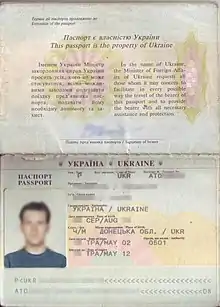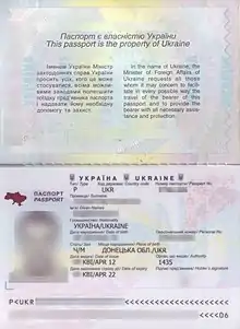 - На первой странице паспорта вверху, написаны слова — «Срок действия паспорта продлён до» (укр. «Термін дії паспорта продовжено до»). Посередине поперёк надпись «Паспорт является собственностью Украины» (укр. «Паспорт є власністю України»), под ней два столбца — на украинском и английском языках с обращением Министра иностранных дел Украины с просьбой облегчить поездку предъявителю паспорта и предоставить ему необходимую помощь и защиту.