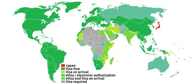 Предполагается, что 191 страна и территория[1] гарантируют безвизовый режим и режим визы по прибытии для владельцев обычных японских паспортов. 152 (виза по прибытии бесплатно высчитывается) страны и территории возможны для безвизового режима. Виза до приезда или предварительная договоренность необходимы для стран или территорий не указанных ниже.