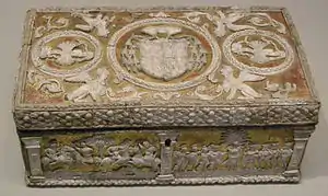 Пастилья из белого свинца на шкатулках или ларцах, как правило иллюстрирует сцены древнеримской истории.