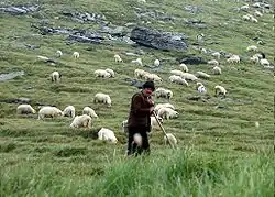 Принадлежности пастуха-чабана: герлыга — длинная палка с крючком в конце, для захвата овец за ноги, гайтан — пояс с висячим карманом (заман), щипчиками для вынимания у больных овец червей (джермела), рогом (для дегтя и синего камня, которым присыпаются раны овец) и ножом.