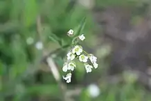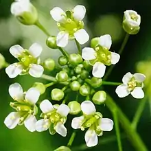 Цветки правильные, четырёхчленные, собраны в кисть, вначале зонтиковидную, потом удлиняющуюся. Чашелистики 0,25 см длиной, лепестки до 0,35 см длиной, обратнояйцевидные, белые.