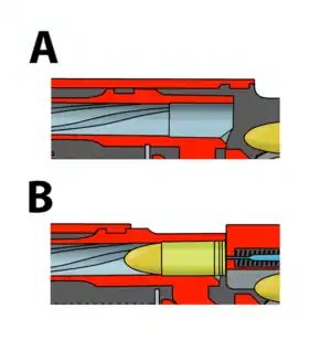 - Фиксация патрона в патроннике осуществляется упором переднего среза гильзы в уступ патронника. Этот способ используется только для патронов с короткими цилиндрическими гильзами, используемых в пистолетах и пистолетах-пулемётах, так как фиксация получается слабой из-за малой площади обеспечивающих фиксацию элементов.