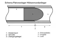 - Фиксация патрона в патроннике осуществляется за счёт упора ската гильзы бутылочной формы в скат патронника. Этот способ обеспечивает достаточно надёжную фиксацию, но пригоден лишь для патронов с бутылочной гильзой и требует большой точности изготовления как гильзы, так и самого патронника.