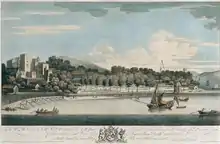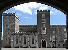 ![]() Вид на замок с юго-запада, на флагштоке развевается геральдический флаг графа Девон. | |