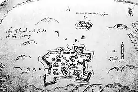 ![]() Одно из старейших изображений форта Дерри, Ирландия. Дерри был разграблен и сожжен кланами О'Доэрти и Макдэвитт в 1608 году. | |