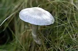 - Шляпка 3—9 см в диаметре, выпуклая, затем становится плоской, гладкая, шелковистая, сухая, окрашена в серовато- или беловато-фиолетовые, позже беловатые или бледно-охристые цвета.