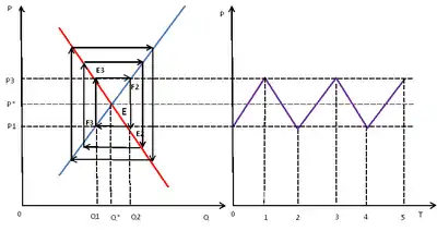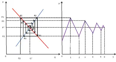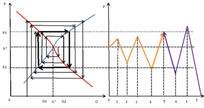 В случае изменения (падения) количества производства до уровня , что соответствует точки на кривой спроса, равной цене , что выше равновесной цены . Новая цена стимулирует производителей производить больше, равной точки на линии предложения, но покупатели готовы покупать только по цене , что соответствует точке на кривой спросе, а значит производители принимают решение сократить производство до уровня на кривой предложения, что позволяет поднять цены до уровня , что соответствует точке на кривой спроса и так далее до точки равновесия [10].