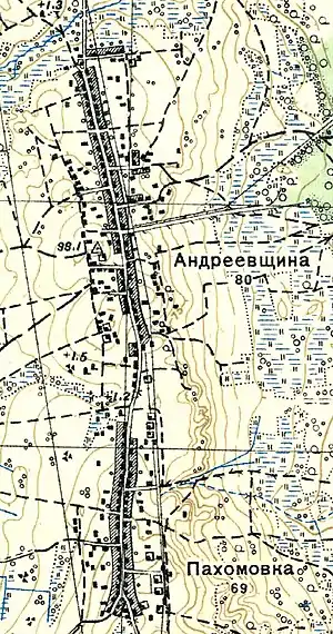 Согласно топографической карте 1938 года деревня Пахомовка насчитывала 69 дворов, Андреевщина — 80 дворов.