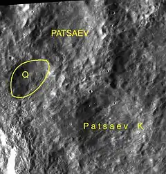 ![]() Снимок зонда Lunar Reconnaissance Orbiter. Кратер Пацаев в центре верхней части снимка. | |
