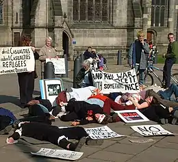 Пацифисты используют различные формы протеста против войны и насилия, в том числе такие необычные, как «Die-in» (имитация смерти).