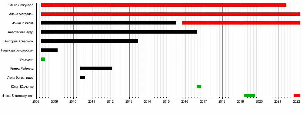 Надежда Бендерская (2008—2009) Виктория Ковальчук (2008—2013) Анастасия Бауэр (2008—2016) Ольга Лизгунова (2008—2021) Лали Эргемлидзе (2010) Римма Раймонд (2010—2012) |