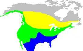 Птица живёт в зарослях кустарника и чащах вблизи водоёмов, на болотах и солончаках на большей части Канады, США и северной Мексики. Птицы из северной области распространения мигрируют в холодное время года плоть до Мексики. Имелись также сообщения о миграции из Норвегии и Великобритании. Эндемичный подвид M. m. graminea, обитавший на острове Санта-Барбара, считается вымершим.