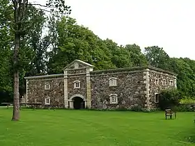 - амбар, построен в 1879 году. Двухэтажное, декоративно расчленённое здание из бутового камня. Под кровлей широкий карниз. Центральная часть выступает в виде ризалита, выложенного доломитовыми камнями. Слегка закруглённая и невысокая притолока из доломитовых блоков, оформляющая вход в здание, опирается на две небольшие колонны с тяжёлыми плитами наверху. Выполненный в классическом стиле ризалит завершается имитирующим каркас горизонтальным карнизом и треугольным фронтоном с камнем, на котором вырезана дата строительства. Закруглённые сверху окна выделены доломитовыми камнями[10];