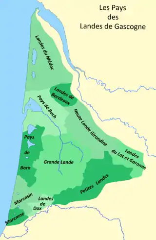 - лесные насаждения на территории края делятся на так называемые заповедные леса, расположенные непосредственно позади прибрежных дюн, и на промышленные леса, расположенные в центре края; последние находятся преимущественно в частной собственности и были высажены в XIX веке в рамках французского «Закона об оздоровлении и реформе культуры в Гасконских Ландах» от 19 июня 1857 года.