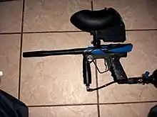 Маска - Маркер (оружие). Маркер состоит из собственно, самого маркера, баллона с газом (сжатый воздух, углекислота) и ёмкости для шаров («фидер» от англ. feeder — «подающий механизм», «лоадер» от англ. loader — «заряжающий» или «хоппер» от англ. hopper — «магазин»). Максимально допустимая скорость вылета шара — не более 91 м/с (327,6 км/ч) или, примерно, 300 футов в секунду согласно правилам[1] — соизмерима со скоростью полёта пули на излёте, попадание шара в глаз может оказаться губительным для глаза, вплоть до его потери.