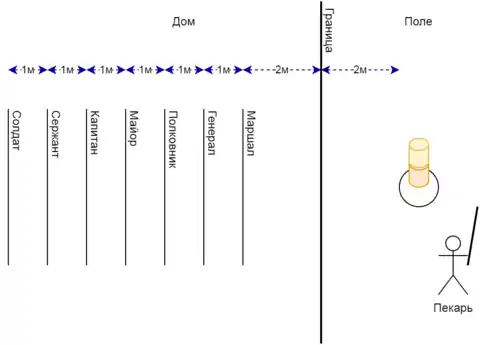Игра проводится на асфальтовой или земляной площадке длиной не менее 10—12 метров. Параллельно короткой стороне площадки, через каждый метр, чертятся линии званий. Зона игроков называется "домом", зона водящего называется "полем". Водящий называется "Пекарем".