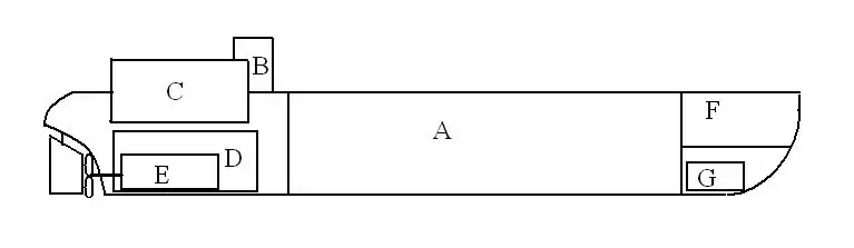 На многих судах под палубой на носу расположено служебное помещение (своего рода кладовка) (F) , а под ней — помещение со вспомогательным двигателем (G) и генератором, дающим судну электроэнергию.