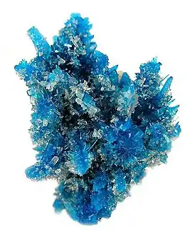 Наиболее характерными для пентагонита являются группы небольших вытянутых призматических прозрачных кристаллов синего цвета, растущих радиально из общего центра (такие образования называются «спреями»).