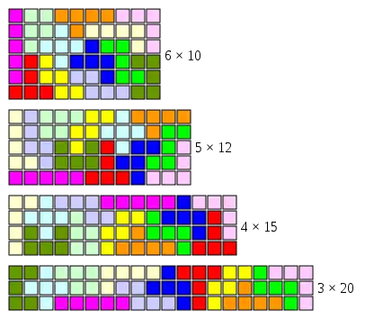 Для прямоугольника 5 × 12 существует 1010 решений, 4 × 15 — 368 решений, 3 × 20 — всего 2 решения (отличающихся вышеописанным поворотом). В частности, существует 16 способов сложить два прямоугольника 5 × 6, из которых можно составить как прямоугольник 6 × 10, так и 5 × 12.
