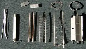 | 1Б | Маломощные высокочастотные, широкополосные пентоды | Усиление напряжения в низкодобротных каскадах с широкой полосой пропускания (телевидение, радиорелейная связь)[39] | Максимально высокая крутизна характеристики[40] (от 10 до 30 мА/В) | Минимально возможное расстояния от катода до первой сетки, густая навивка первой сетки (6Ж9П — шаг намотки 17 витков/мм) на рамочном каркасе, золочение первой сетки. Пониженная рабочая температура катода, особые гладкие покрытия катода[41]. Как следствие — наибольшая стоимость среди всех типов пентодов[42] | 6Ж9П, 6Ж11П[42] |