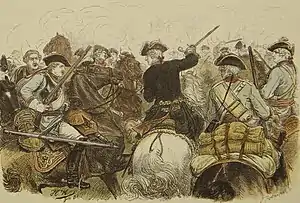 ![]() Столкновение австрийской и прусской кавалерии в битве при Мольвице, 1771 год. Картина работы Августа Генриха Фердинанда Тегетмейера | |||