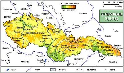 Первое чехословацкое государство состояло из Богемии, Моравии, Чешской Силезии, Словакии и Подкарпатской Руси. В сентябре 1938 года Нацистская Германия присоединила к себе Судетскую область по Мюнхенскому соглашению (сговору) при участии Франции, Великобритании, Италии. Польша оккупировала Тешинскую область, а южную часть Словакии и Подкарпатской Руси отделили в пользу Венгрии (Первый Венский арбитраж). Это фактически положило конец Первой Чехословацкой Республике, которую сменила недолговечная Вторая Чехословацкая республика.