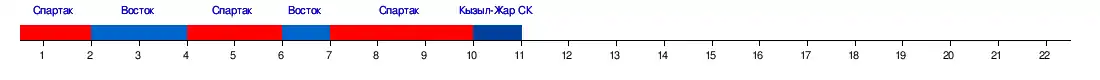 | Кызыл-Жар СК | 2:0 | 2:0 | 4:1 | 1:0 | 2:1 | 0:0 | 1:1 | 3:0 | 0:1 | 0:1 | 3:0 | 2:0 | |