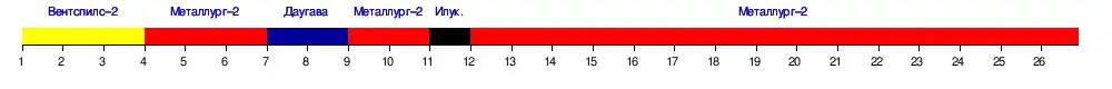 | Вентспилс-2 | 3:1 | 5:0 | 3:4 | 0:0 | 4:0 | 4:0 | 2:0 | 2:4 | 3:0 | 2:2 | 4:0 | 4:1 | 2:0 | |