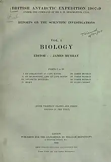 - British Antarctic expedition, 1907-9, Under the command of Sir E.H. Shackleton, c. v. o. Reports on the scientific investigations. — L. : W. Heinemann, 1910—1916. — Vol. 1—4. — The two volumes on biology were issued in parts, those of each volume paged continuously, and are without title pages. Geology, edited by T. W. E. David and R. E. Priestley. Biology, edited by James Murray.