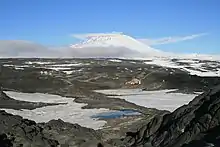 Хижина Шеклтона на фоне Эребуса в 2007 году