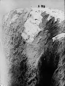 Вся операция заняла неделю, кратерный отряд располагал запасами на 11 дней пути, вспомогательный — на шесть (в сумме 600 фунтов, погружённых на нарты). К шести часам вечера расположились лагерем на высоте 800 м, при температуре −23 °C, на базе было на десять градусов теплее. На второй день, несмотря на большие заструги, препятствующие восхождению, и каменные осыпи, была достигнута высота 1716 м, при температуре −33 °C. Сразу же вскрылся существенный изъян в планировании: на крутом склоне было невозможно буксировать нарты, а в экспедиции не было ни одного рюкзака. Моусон и профессор Дэвид тащили сумки с едой и части от палатки, Маршалл и Броклхёрст также тащили еду в кожаных сумках, подвязывая их сбруей от нарт; Адамс волок кухонный аппарат. На каждого приходилось, по крайней мере, 40 фунтов груза[69][68]. Наутро Адамс решил, что до вершины должны дойти все. Общий отряд на третий день добрался до точки 2655 м; стоял тридцатиградусный мороз, а начавшаяся метель блокировала экспедиционеров на 32 часа — до четырёх утра 9 марта. Палатка была забита снежной пылью, не было возможности разжечь примус, и путешественники, страдая от жажды, сосали шоколад и галеты. Не имевший полярного опыта Броклхёрст (ему только исполнился 21 год) сильно отморозил ноги, когда справлял естественные потребности; вдобавок, он был единственный, кто остался в ботинках, а не носил лапландские каньги. Его оставили в старом кратере[70][71]