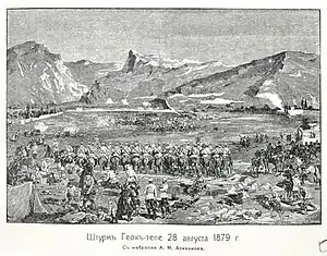После покорения Хивинского ханства в 1873 году, русское командование обратило внимание на туркмен. В том же году войска под командованием генерала Кауфмана нанесли несколько поражений туркменам.