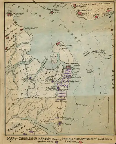 В начале июня 1863 года бригадный генерал Куинси Гилмор сменил генерал-майора Дэвида Хантера на посту командующего Южным департаментом северян. Гилмор, военный инженер, в апреле 1862 года добился успеха при взятии форта Пуласки. Он начал подготовку к высадке на острова Моррис и Джеймс, защищавшие южные подступы к Чарлстонской гавани. Если бы на этих островах северянам удалось разместить осадную артиллерию, они могли бы обстреливать форт Самтер, орудия которого не позволяли флоту северян войти в гавань[2].