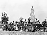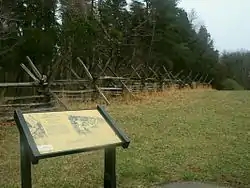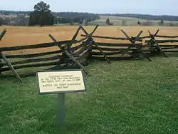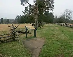 Оригинальный текст (англ.)[показатьскрыть]– Just about daylight I nociced two of the enemy's vedettes coming over the hill through the broomsedge. They were carrying their guns at trail arms, and, although coning in our direction, they did not see us, for they had their attention on the men at the Stone Bridge. Press Cowan and I ... walked up to the fence by the edge of the field, about 40 feet from the bank of Bull Run. The vedettes came on until they were within a hundred yards of us. I laid my gun down across the top rail and ran my eye down the barrel. At that instant Press Cowan, who was standing a step behind me, fired. This was the first musket fired at the Battle of Manassas. It was fired by Press Cowan, a private of Co. J, of the 4th South Carolina Infantry. It was about £00 yards below the Stone Bridge and about 40 feet from the bank of Bull Run, on the Centreville side, about 6 o'clock in the morning. .— [29]