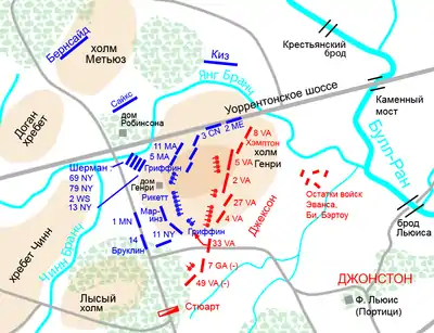 11-й Нью-Йоркский пехотный полк — «Огненные зуавы» — встал позади орудий Рикеттса. Морские пехотинцы встали левее, а 1-й Миннесотский правее. 14-й Бруклинский задержался у переправы через Янг-Брэнч, а 38-й Нью-Йоркский поднялся на холм и встал левее дома Генри, где оказался даже раньше, чем батарея Гриффина. Развернулась ожесточённая орудийная перестрелка на короткой дистанции. Генерал Джексон разъезжал вдоль своей пехотной линии, повторяя: «Всё хорошо…» «Он казался очень спокойным, — вспоминал рядовой 5-го Вирджинского, — и мы решили, что действительно всё в порядке и что обычно сражения так и выглядят»[68].