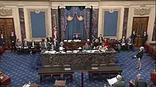 16 января 2020 года в Сенате Конгресса США были официально представлены статьи обвинений в адрес президента Дональда Трампа в рамках процедуры суда над президентом. В Сенате приняли семерых уполномоченных Палаты представителей, которые передали коллегам две статьи обвинений. Таким образом была формально начата вторая часть процесса[130]. В этот же день к присяге были приведены председатель Верховного суда США Джон Робертс (под его председательством проходило судебное разбирательство) и все сенаторы[131].