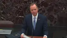 Первую телетрансляцию посмотрело 13,8 млн человек. Ответственным за проведение процедуры импичмента назначен Адам Шифф, глава комитета Палаты представителей по разведке. Открывая слушания, он изложил версию событий, которой придерживались организаторы импичмента — согласно этой версии, Дональд Трамп задержал передачу Украине почти 400 млн долларов и оказывал давление на украинского президента Владимира Зеленского, требуя от него расследовать деятельность газовой компании Burisma и утверждения, что Украина вмешивалась в американские выборы 2016 года. Сам Трамп обратился к согражданам со словами о том, что речь идёт о «самом грандиозном скандале в истории американской политики»[95].
