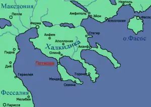 В 432 году до н. э. Афины отправили в Македонию против Пердикки 1000 гоплитов на 30 кораблях под командованием Архестрата. Также стратегу следовало помочь претенденту на македонский престол Филиппу. Одной из задач Архестрата было вынудить жителей Потидеи срыть городские стены, а также взять оттуда заложников. Ещё до того, как афинские войска прибыли в Македонию в Потидее началось восстание[36]. Этот древнегреческий город на Халкидиках был основан коринфянами. В V веке до н. э. Потидея входила в состав Афинского морского союза, однако её жители не утратили связь с метрополией. В частности, Коринф ежегодно отправлял в Потидею уполномоченных магистратов — эпидемиургов. По мере роста афинских амбиций отношения между Коринфом и Афинами ухудшились, а к 433 году до н. э. ситуация резко осложнилась вследствие участия афинских кораблей в битве при Сиботских островах на стороне керкирян против коринфского флота. Опасаясь, что жители Потидеи могут восстать против власти Афин и склонить к тому же другие города северного побережья Эгейского моря, афиняне приказали потидейцам снести южную часть городской стены, выдать заложников и не принимать коринфских эпидемиургов[37][38]. Потидейцы сначала стремились уладить конфликт мирным путём. Внешнеполитическая ситуация складывалась для них благоприятно. Спартанцы заверили горожан, что после нападения афинян на Потидею они вторгнутся в Аттику. Заключив союз с халкидикийцами и племенем боттиев, Потидея решились отпасть от Афин[39][38].