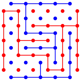 Игроки, красный и синий, проводят отрезки между двумя соседними точками своего цвета. Побеждает тот, кто сумел перебросить мостик от края до края доски: красный игрок по горизонтали, синий по вертикали.