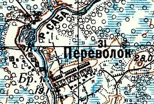 ПЕРЕВОЛОКА — деревня удельная при реке Сабе, число дворов — 17, число жителей: 58 м. п., 69 ж. п.[7](1862 год)