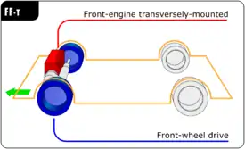 При поперечном размещении двигателя и коробки передач отпадает необходимость в дорогой конической передаче, а ведущий мост сводится к двум приводным валам с надёжными шарнирами, находящимся в моторном отсеке. Размещение в передней части двигателя высвобождает место сзади, позволяя разместить большой багажник сзади. Недостатком подобной схемы является тот факт, что большой двигатель с коробкой поперёк не размещается (наиболее крупным является рядный 6-цилиндровый двигатель). Также при разгоне автомобиль как бы «приседает» на заднюю ось, поскольку туда переносится вес: при мощном двигателе передние колёса высвобождаются, но начинают буксовать. Вследствие этого в высокопроизводительных автомобилях редко используется ПП-компоновка: электронная система управления сцеплением может помочь избежать подобных проблем, но при этом сводит на нет все преимущества мощного двигателя[4]. Примерами автомобилей с поперечным размещением двигателя являются ВАЗ-2108, Kia Rio, Toyota Camry, Volvo S80 и многие другие автомобили. При размещении мотора продольно перед передней осью коробка передач оказывается под панелью приборов, а коническая главная передача — внутри коробки передач, но ближе к двигателю. Теоретически здесь может размещаться мощный двигатель без каких-либо ограничений, однако передний свес оказывается слишком длинным у мощных машин, а передняя ось перегружается: автомобиль поворачивает и тормозит хуже, а разгруженные задние колёса попросту бесполезны. Примерами подобных автомобилей с продольным размещением двигателя являются Москвич-2141 или модели Audi без полного привода[3] (для решения возникающих проблем в автомобили Jensen FF и линейку Audi позже была внедрена система полного привода, известная в Audi под названием quattro).