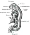![]() Диаграмма, изображающая главные подотделы эмбрионального позвоночного мозга. Эти области позже разделяются на структуры передний мозг, средний мозг и ромбовидный мозг | |