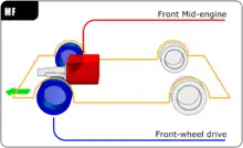 Двигатель расположен поперечно, обычно последовательно с трансмиссией. Данная компоновка позволяет достичь большой компактности силового агрегата в продольном направлении и за счёт этого очень эффективно использовать длину автомобиля, при этом отсутствует необходимость в дополнительном усложнении силового агрегата, характерном для компоновки с расположением двигателя поперёк над осью. Благодаря этому данная компоновка является основной на современных малых автомобилях и имеет широкое распространение на автомобилях среднего класса.[5] Впервые была применена, видимо, на прототипах фирмы DKW ещё до Второй мировой войны, от её продукции была перенята ГДР-овским «Трабантом» и шведским «Саабом».