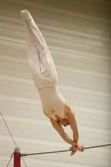 - подъём махом вперёд с перемахом через боковую плоскость в вис или с поворотом на 180 в упор;