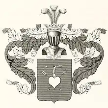 В щите, имеющем голубое поле, изображено серебряное сердце, пронзённое крестообразно двумя золотыми стрелами, остриями вниз, а на поверхности сердца видна выходящая рука в золотых латах со стрелою, которая обращена в правую сторону.