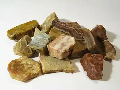 Окраска слоев в переливте, в особенности добытом с приповерхностных развалов, весьма разнообразна: встречаются белые, зеленовато- или голубовато-серые, розовые, буровато-красные и почти малиновые цвета. Розовые, красные и коричневые тона, создаваемые гидроокислами железа, с глубиной постепенно исчезают, и доминируют голубоватый или зеленоватый цвета камня. Рисунок камня в коренном залегании оказывается менее эффектным.