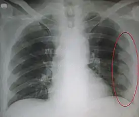 ![]() Рентгенограмма грудной клетки. Обозначена область множественных старых переломов рёбер. | |