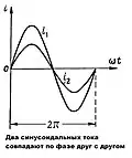 Два переменных синусоидальных тока совпадают по фазе, если они имеют одинаковые фазы и, следовательно, одновременно достигают своих нулевых и максимальных значений одинакового знака.